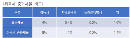 - 취득세: 부동산 취득 시 지자체에 납부하는 지방세